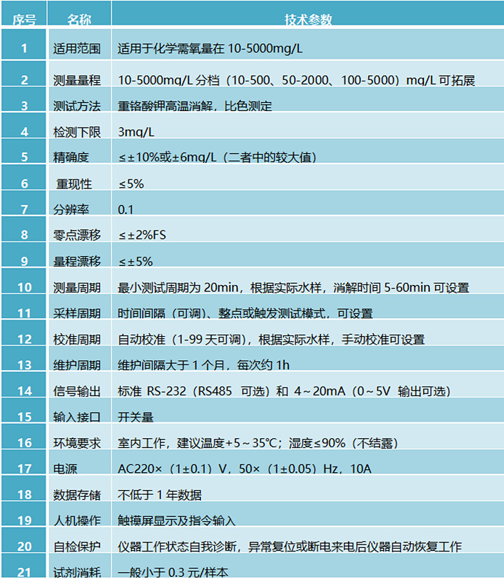 化学需氧量(又称COD)是指在一定条件下,用强氧化剂将水样中有机物和无机还原性物质氧化时所消耗氧化剂相对应氧的质量浓度,COD也是反映水体受有机物和无机还原性物质污染程度的重要指标。